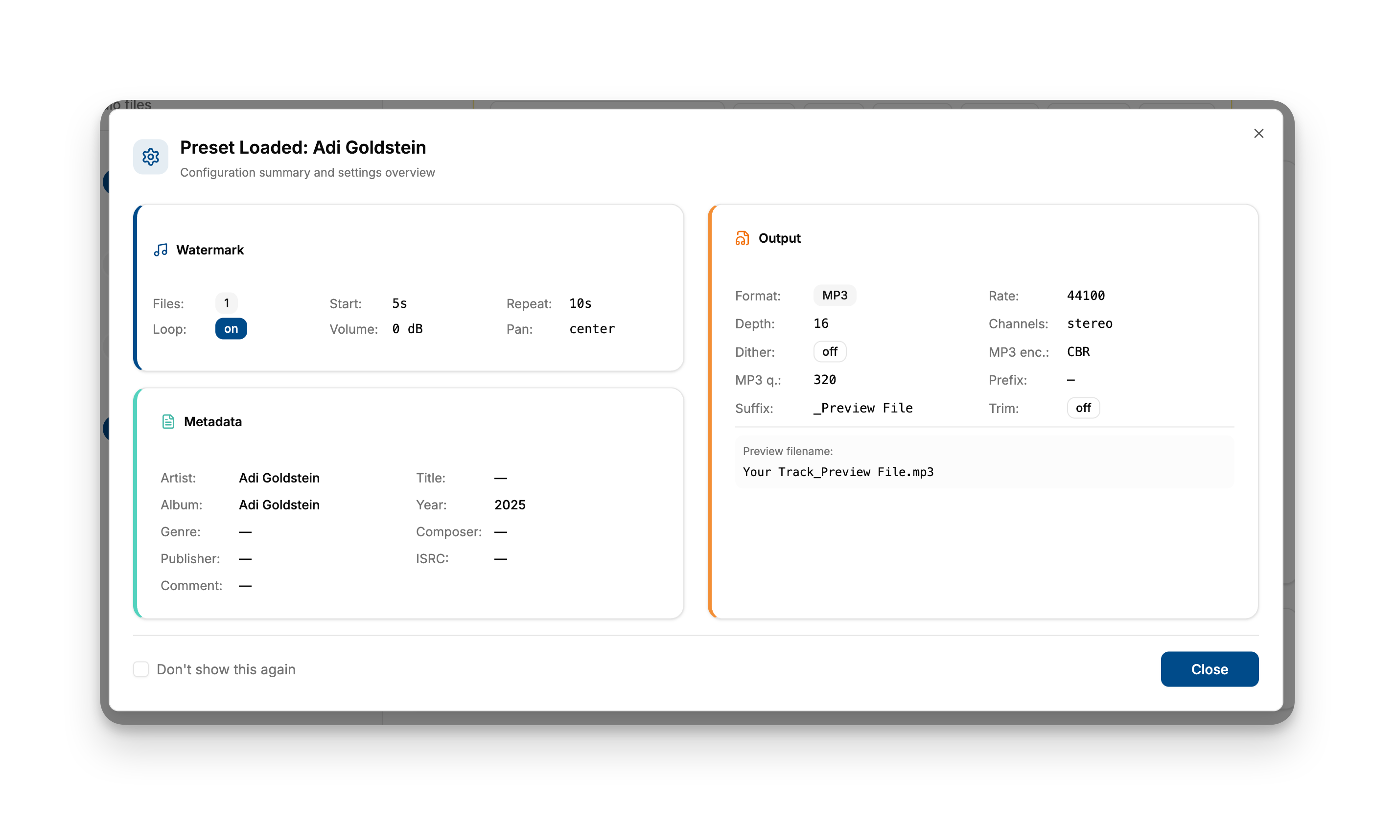 With the new preset manager, you can view a comprehensive summary of all the values and parameters saved in your preferred and favorite presets. Now you can also save your favorite meta tags, output settings, watermark settings, watermark files, and volumes.